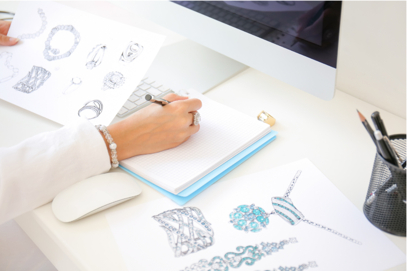 Learn jewellery sketching fundamentals: line quality, proportion, symmetry, perspectives, gemstone settings, shading, textures, and concept development through sketches.